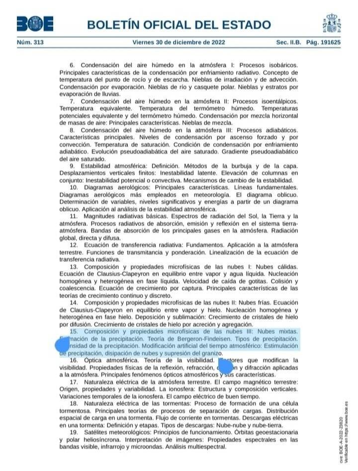Según la Resolución del 27/12/2022, los aspirantes al proceso selectivo para ingresar en el Cuerpo Superior de Meteorólogos del Estado, deben demostrar conocimientos sobre "MODIFICACIÓN ARTIFICIAL DEL TIEMPO ATMOSFÉRICO", porque las estelas químicas son teorías de conspiración