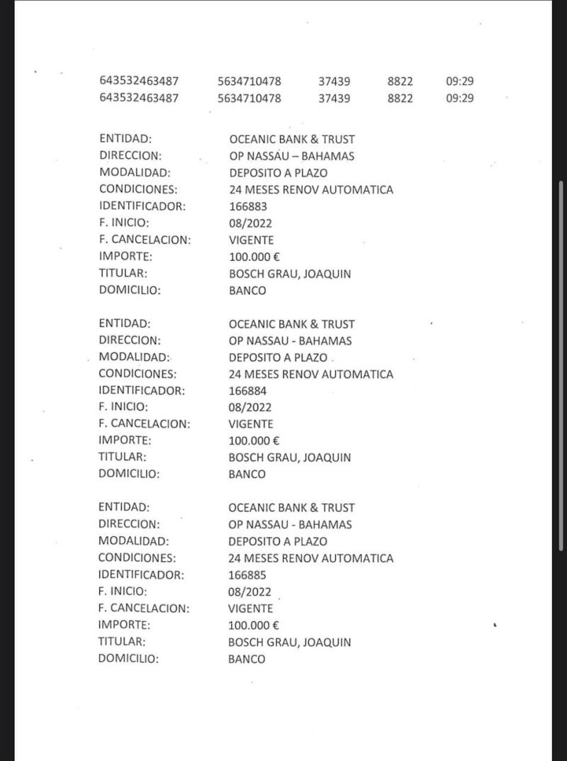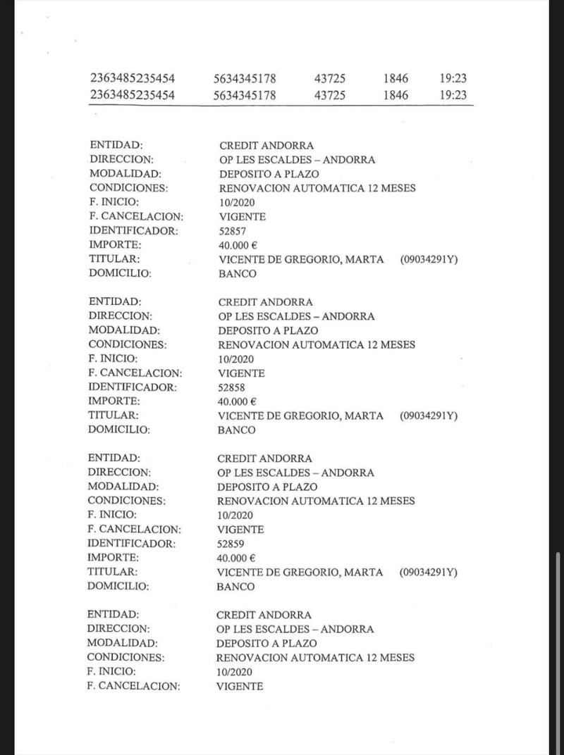 En concreto Joaquin Bosch Grau es titular de 12 depósitos de 100.000 € que le fueron ingresados en septiembre de 2018 y agosto del 2021, junto con dos cuentas a la vista de 153.573 € y 190.274 € respectivamente (por un importe total de 1.543.847 €) en la entidad Kleinwort Hambross Bank, Oficina Principal de ST HELIER- JERSEY, con domicilio en 18 Esplanade, St Helier, Jersey JE4 8PR, Jersey y Marta Vicente de Gregorio, Magistrada titular del Juzgado de lo Penal 3 de Toledo, como titular de 10 depósitos de 40.000 euros cada uno (hasta hacer un total de 400.000 €) que le fueron ingresados en octubre de 2020 en la entidad Credit Andorra de OP LES ESCLADES – ANDORRA.