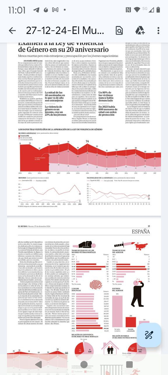 Un análisis "metaperiodístico" del artículo de El Mundo sobre el 20 aniversario de la ley de violencia de género indica que este diario ha querido sacar a la luz algunos datos que ponen en cuestión la citada ley (como el elevado porcentaje de crímenes cometidos entre extranjeros, que muchos hombres se suicidan después del asesinato, que también hay mujeres que matan a sus maridos y que una buena parte de los jóvenes no cree en esta ingeniería social) sin salirse del "marco establecido", y para ello han contado con la ministra socialista que redactó esta vergüenza histórica.