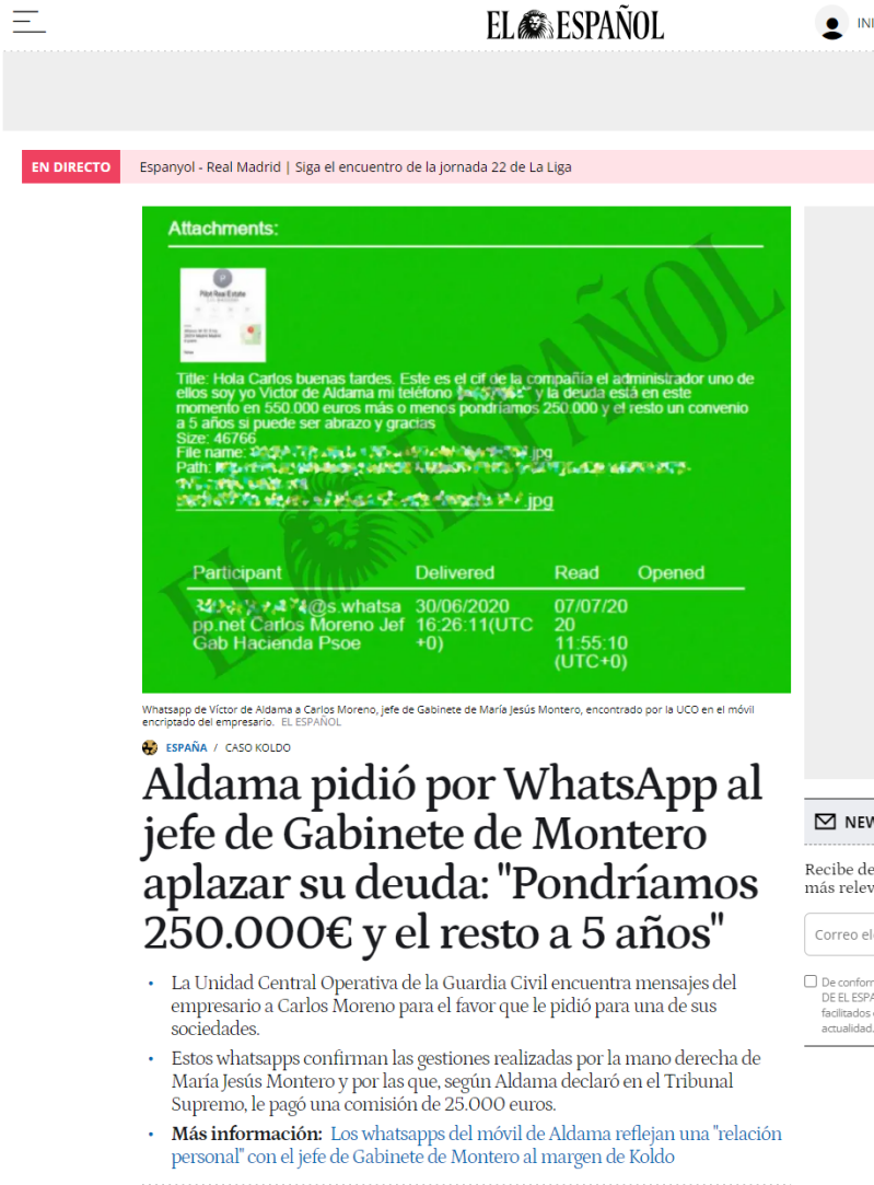El diario El Mundo desvela mensajes entre Ángel Víctor Torres, su mano derecha, Antonio Olivera, y Koldo García con documentos reservados del Gobierno como expedientes y órdenes de pago por las mascarillas. Koldo se los reenviaba directamente a Víctor de Aldama.