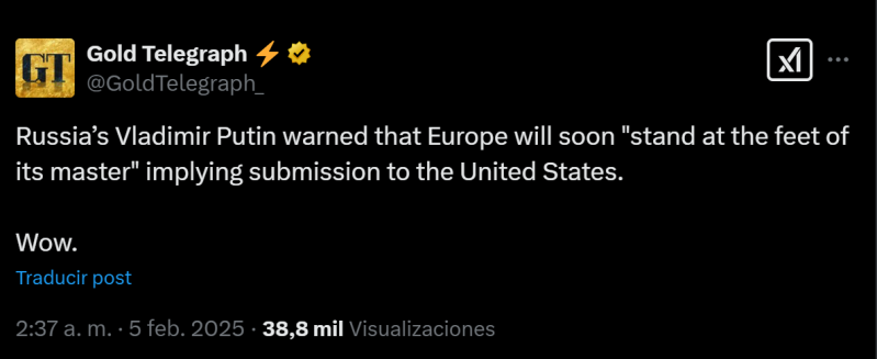 Putin afirma que "Europa caerá rendida a los pies de su amo", entendiendo que acabará sometiéndose a las presiones del nuevo gobierno de Estados Unidos.